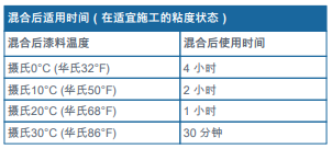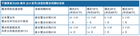 -最大覆涂間隔時(shí)間主要取決于表面的實(shí)際溫度 - 而不是簡單地只看大氣溫度。置于太陽直射暴曬或表面加熱的環(huán)境下, 涂層的最大覆涂間隔時(shí)間將會縮短。