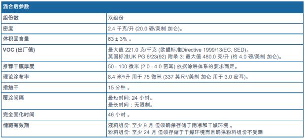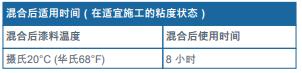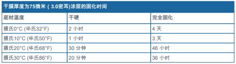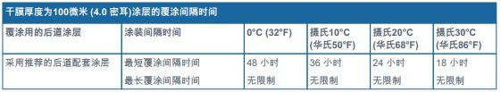 -對于進行自身覆涂以期達到規(guī)定干膜厚度要求時, 建議在2天時間內,須于涂層完全固化前完成。對于自身覆涂而言, 則沒有最短覆涂間隔時間的限制規(guī)定。